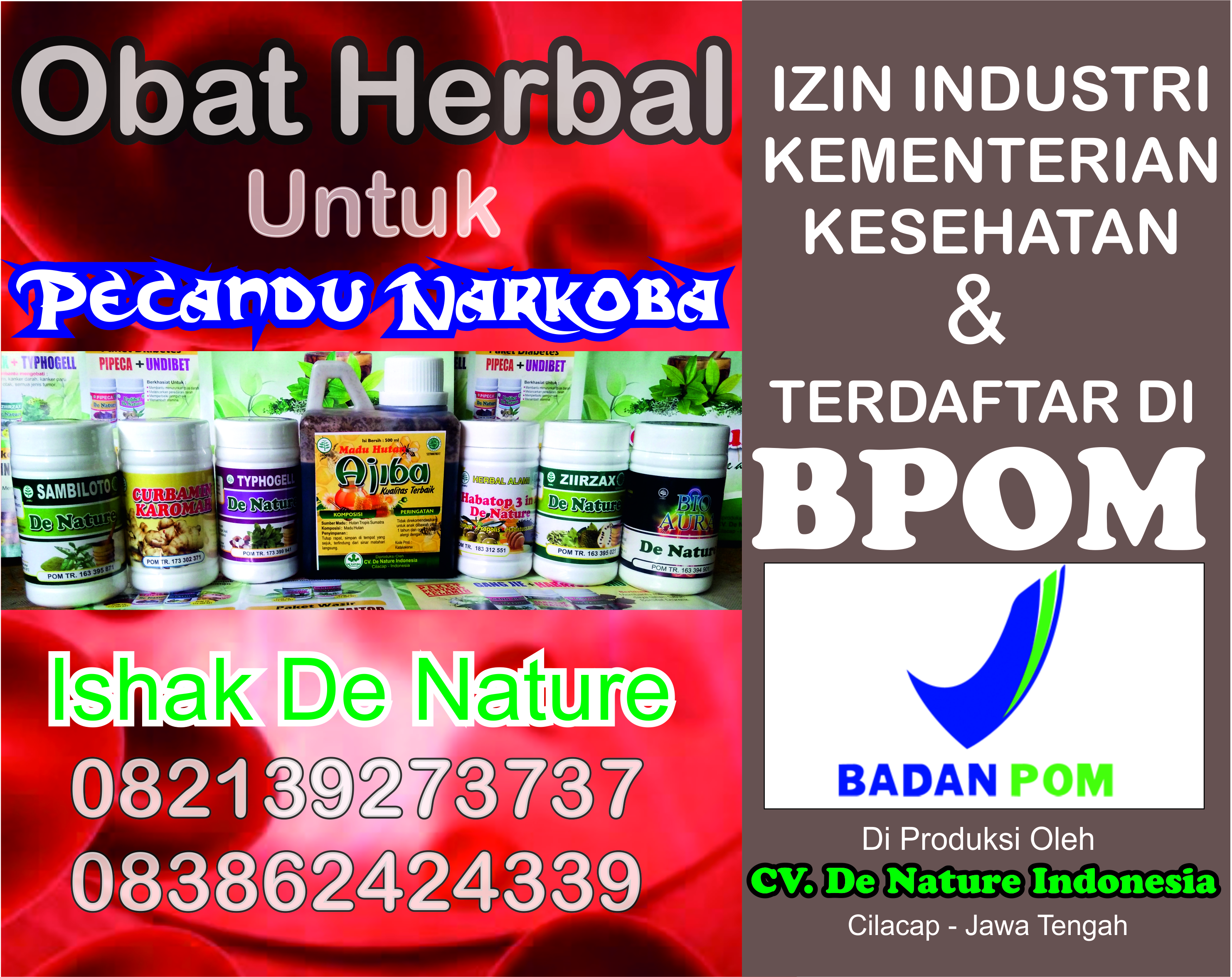 Kami De Nature Indonesia menjual Obat Untuk Pecandu Narkoba yang bisa mengurangi kecanduan narkoba dan bisa memperbaiki sel saraf saraf yang telah rusak akibat bahan kimia yang terkndung dalam Narkoba.